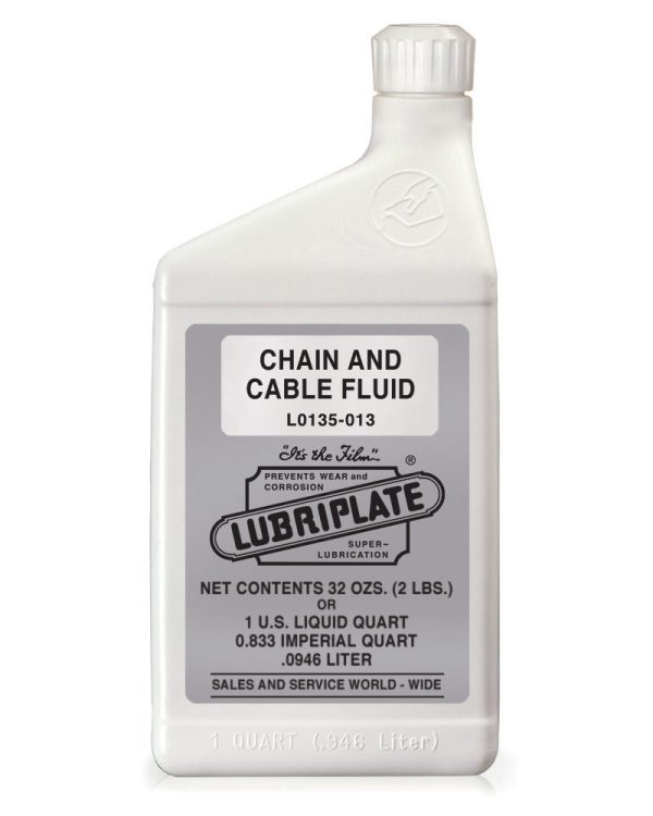 LUBRIPLATE Chain & Cable Fluid is a lubricating, penetrating and cleansing fluid designed for a multitude of applications. This product will not produce a dry surface; it will maintain a moist film. This unique film, however, will not pick up dust and dirt, but rather acts as a cleansing agent. In the lubrication of wire rope, it is essential not only to protect the outside of the wire, but also to penetrate into the strands to lubricate and reduce friction between these strands and to lubricate and protect the inner core from rust and corrosion. The same basic principles also apply to the lubrication of roller chains — the required penetration, cleansing and lubrication of the inside of the links is vital in addition to the outside protection and lubrication. LUBRIPLATE Chain & Cable Fluid performs all of these functions most successfully.