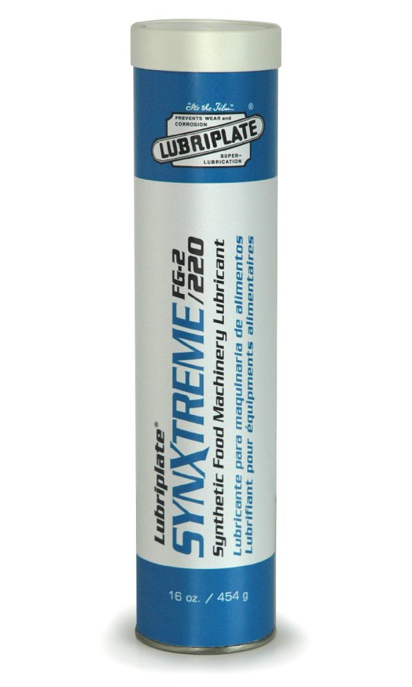 Now treated with LUBRI-ARMOUR, LUBRIPLATE?s anti-microbial additive developed to prevent the decomposition of lubricants caused by microorganisms. LUBRIPLATE SYNXTREME FG greases treated with LUBRI-ARMOUR, remain fresh and last longer in harsh food processing plant environments. LUBRIPLATE SYNXTREME FG/220 products are 100% synthetic, calcium sulfonate based greases. Their advanced technology delivers outstanding shear stability, reduced wear and excellent resistance to water and other corrosive substances. These food grade greases are manufactured with ingredients that comply with FDA 21 CFR 178.3570, FDA 21 CFR 172.882 and FDA 21 CFR 182 G.R.A.S. The heavy, 100% synthetic fluid used in these greases delivers increased oxidation stability and enables them to be effective at application temperatures between 450?F and 500?F with frequent re-lubrication intervals.